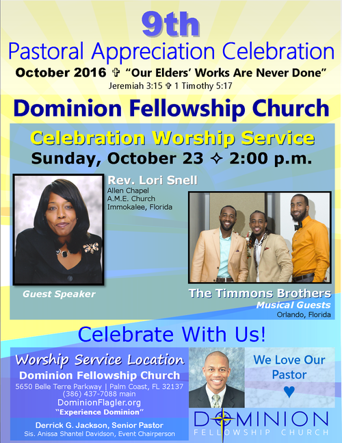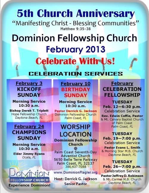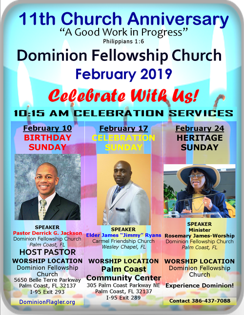 The Dominion Fellowship Church family celebrates eleven (11) years of Kingdom growth and impact in the Flagler County/Palm Coast, Florida community.