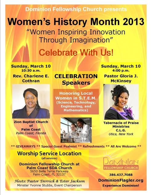 Dominion Fellowship Church joined with our community in honoring local women during Women's History Month. Each week, special worship services were held and a Celebration Luncheon, a non-religious event, was held on Saturday, March 24, 2012 at 11:30 a.m.
