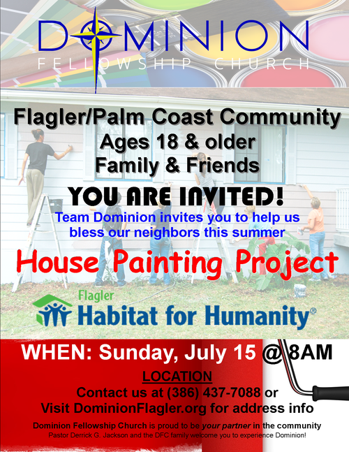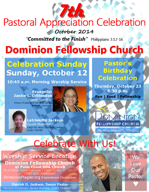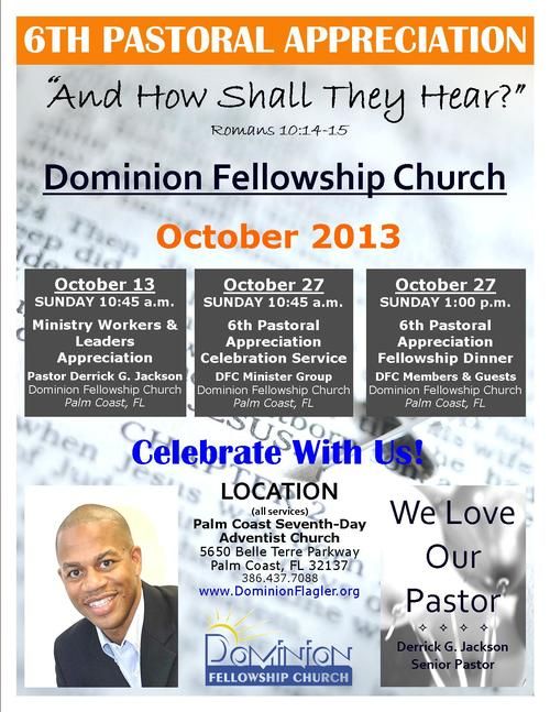 God has blessed us abundantly since Dominion Fellowship Church began on February 10, 2008. Pastor Derrick G. Jackson, Lady Ester, and family THANK EVERYONE who has helped to make Dominion Fellowship Church a viable part of the Kingdom effort in Flagler County.