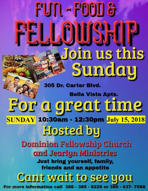 At Dominion Fellowship Church, WE LOVE TO FELLOWSHIP. The assembling of Christians is a vital function within the operation of the local church. PEOPLE NEED EACH OTHER. People are able to maximize the fulfillment of their human need for healthy friendships and positive working relationships when they assemble together in a loving church environment. This church provides members, families, and its neighbors with numerous opportunities to share with each other in the church setting AND in the community. FEEL FREE TO SHARE WITH US during our regularly scheduled activities (click the "Weekly Schedule" button) and our special events listed below.